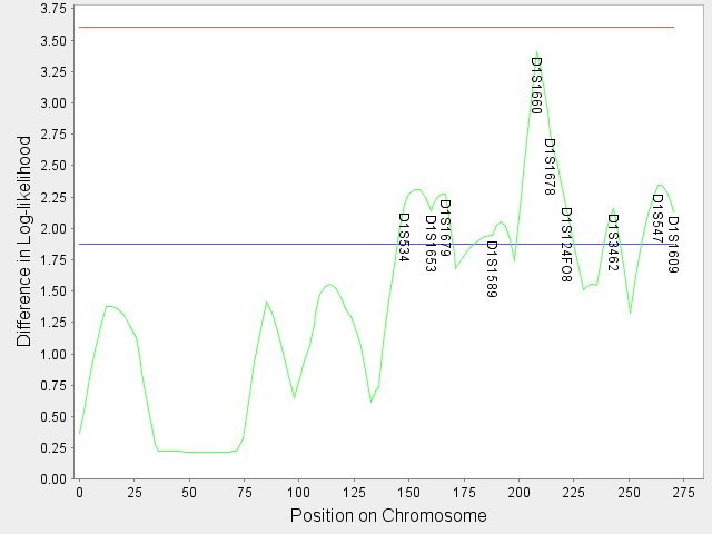 are computed. The difference between the log-likelihoods is used for determining the significance level of linkage. Under certain regularity conditions, the twice of the difference follows a mixture of chi-square distribution under the null hypothesis (