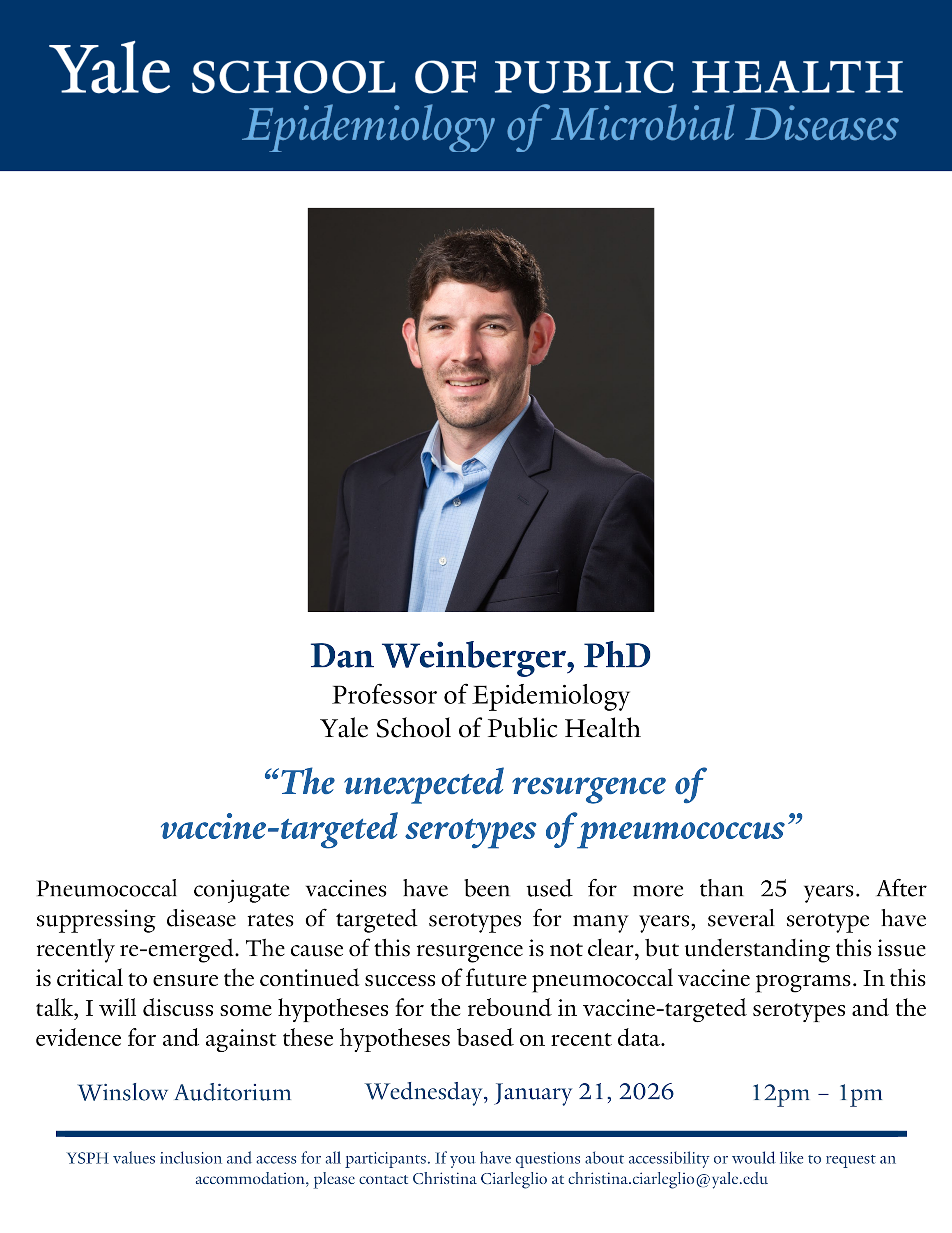 If you have questions about accessibility or would like to request an accommodation, please contact Christina Ciarleglio at christina.ciarleglio@yale.edu