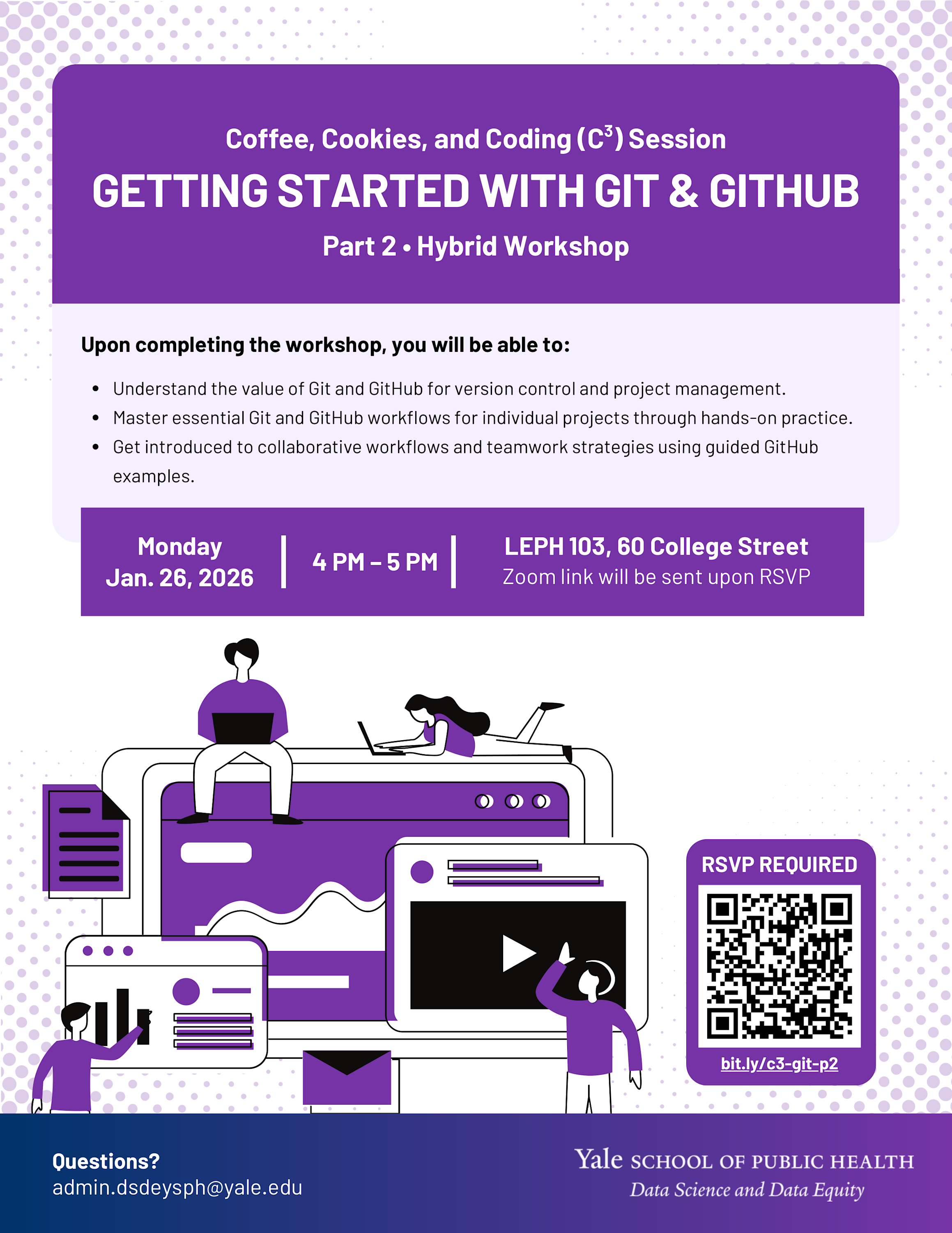 Everyone (Public)Getting Started with Git and Github - Part 2Yale School of Public Health (LEPH)Add event to CalendarContactShelby Goldenshelby.golden@yale.eduHostJackson Higginbottom, MPHjackson.higginbottom@yale.eduAdmissionFreeEvent TypeWorkshopFoodSnacksJan 202626Monday4:00 PM5:00 PMRegister for this eventDownload FlyerEdit This Event