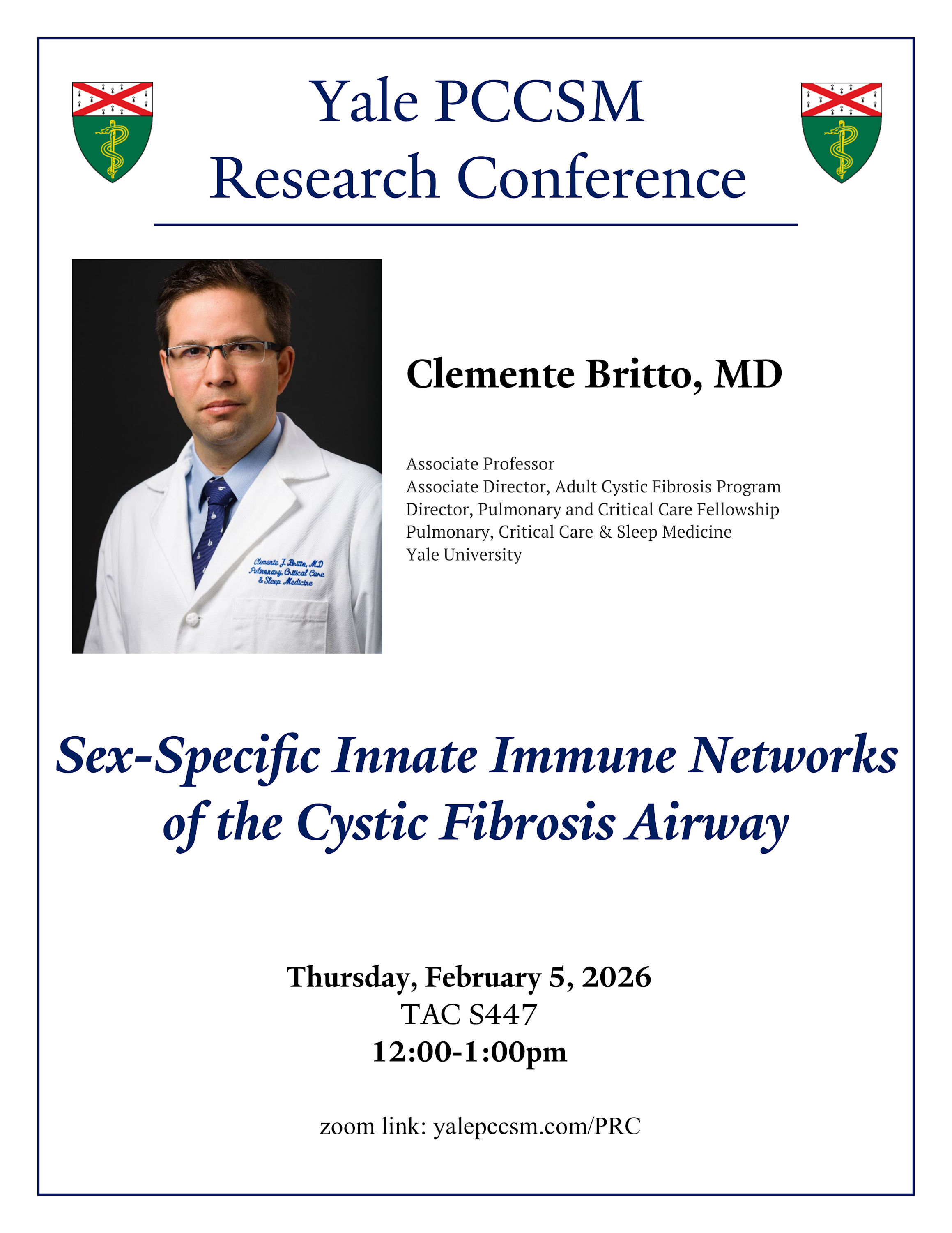 Everyone (Public)PCCSM Research Conference - Sex-Specific Innate Immune Networks of the Cystic Fibrosis AirwayThe Anlyan Centerhttps://yalepccsm.com/PRCAdd event to CalendarAdd event series to CalendarSpeakerClemente Britto-Leon, MDAssociate Professor Term; Associate Director. Adult Cystic Fibrosis Program., Pulmonary, Critical Care & Sleep Medicine; Director. Pulmonary and Critical Medicine Fellowship Training Program., Pulmonary, Critical Care & Sleep MedicineContactLindsey Kronkaitis203.785.2993lindsey.kronkaitis@yale.eduAdmissionFreeEvent TypeConferences and SymposiaTagsInternal MedicinePulmonary, Critical Care and Sleep MedicineFoodLunch: Lunch is served prior to the conference, starting at 11:50AM.Next upcoming occurrences of this eventJan 202629ThursdayEventPCCSM Research Conference"More Options Than Ever for Preventing RSV and Pneumococcus, But is it All Good News?"Speaker: Daniel Weinberger12:00 PM1:00 PMFeb 202612ThursdayEventPCCSM Research Conference - Unraveling the Metabolic Contributions to Asthma: Roles of Sex, Hormones, and ObesitySpeaker: Shannon Kay12:00 PM1:00 PMFeb 202626ThursdayEventPCCSM Research Conference - Pandemic Preparedness and Preventing SARS-CoV-3Speaker: Craig Wilen12:00 PM1:00 PMFeb 20265Thursday12:00 PM1:00 PMDownload FlyerEdit This Event