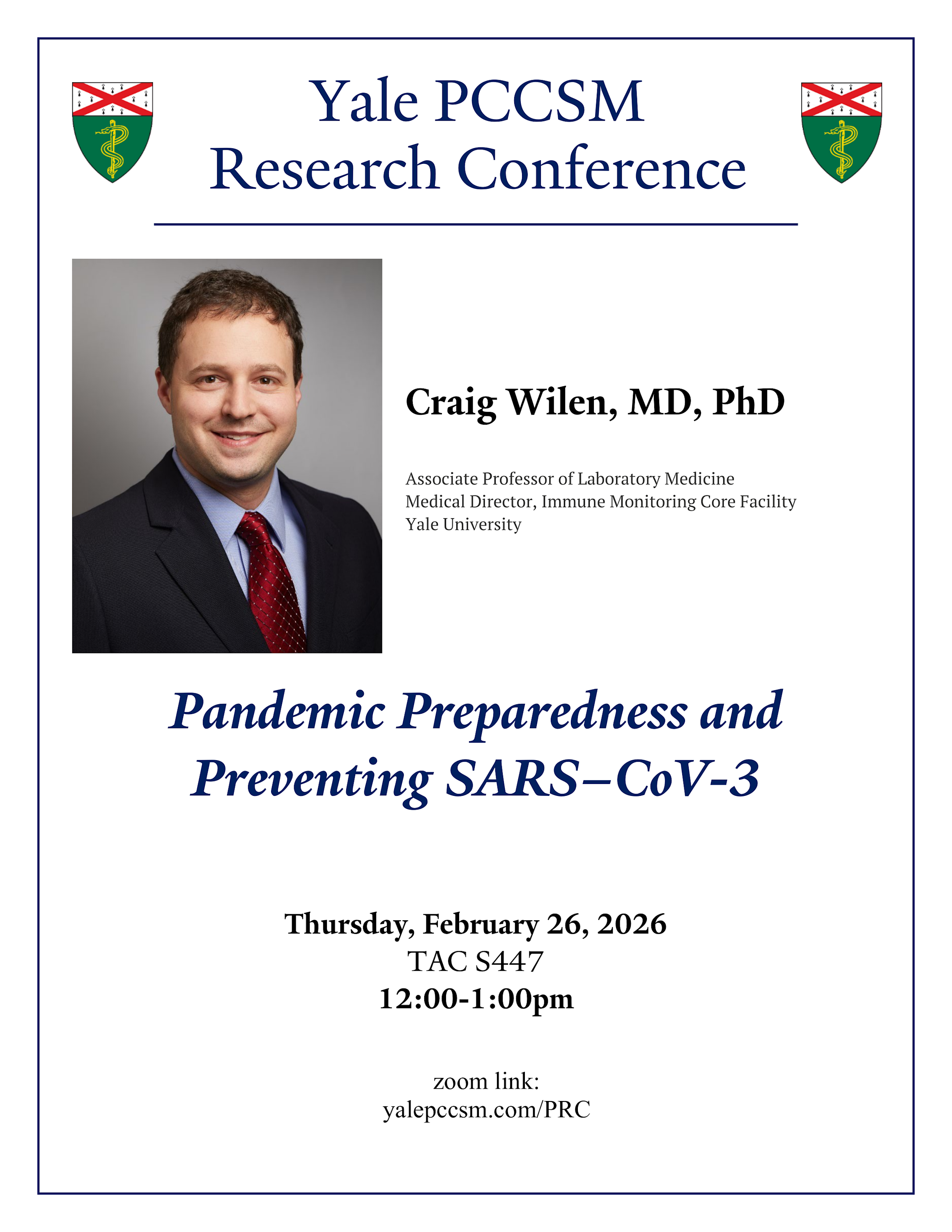 Everyone (Public)PCCSM Research Conference - Pandemic Preparedness and Preventing SARS-CoV-3The Anlyan Centerhttps://yalepccsm.com/PRCAdd event to CalendarAdd event series to CalendarSpeakerCraig B. Wilen, MD, PhDAssociate Professor of Laboratory Medicine and of Immunobiology; Medical Director, Immune Monitoring Core FacilityContactLindsey Kronkaitis203.785.2993lindsey.kronkaitis@yale.eduAdmissionFreeEvent TypeConferences and SymposiaTagsInternal MedicinePulmonary, Critical Care and Sleep MedicineFoodLunch: Lunch is served prior to the conference, starting at 11:50AM.Next upcoming occurrences of this eventJan 202629ThursdayEventPCCSM Research Conference"More Options Than Ever for Preventing RSV and Pneumococcus, But is it All Good News?"Speaker: Daniel Weinberger12:00 PM1:00 PMFeb 20265ThursdayEventPCCSM Research Conference - Sex-Specific Innate Immune Networks of the Cystic Fibrosis AirwaySpeaker: Clemente Britto-Leon12:00 PM1:00 PMFeb 202612ThursdayEventPCCSM Research Conference - Unraveling the Metabolic Contributions to Asthma: Roles of Sex, Hormones, and ObesitySpeaker: Shannon Kay12:00 PM1:00 PMFeb 202626Thursday12:00 PM1:00 PMDownload FlyerEdit This Event