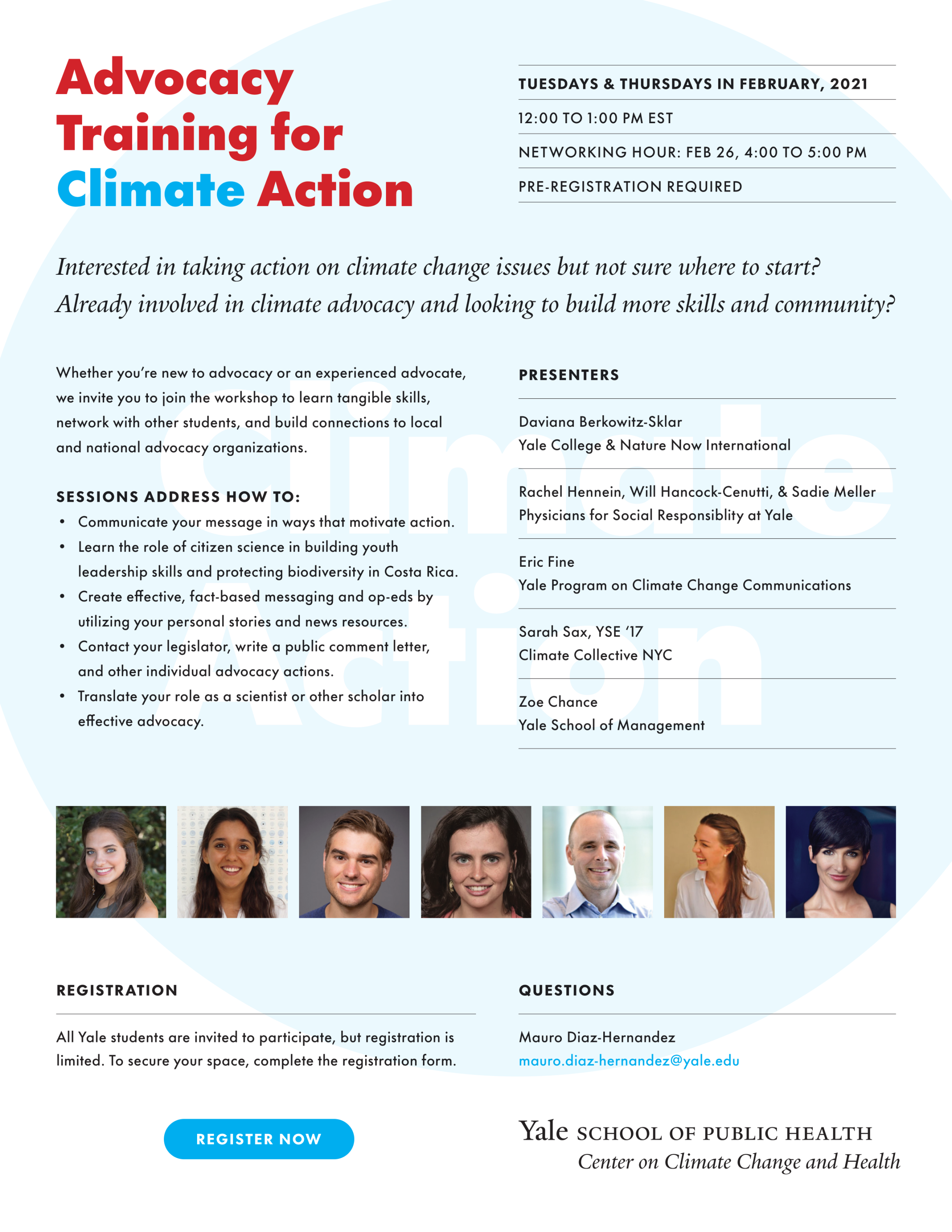 Join the Yale Center on Climate Change and Health for our "Advocacy Training for Climate Action" workshop series 12-1 PM EST, Tuesdays and Thursdays in the month of February. This event is open only to students from across Yale University (undergraduate, graduate, and professional).