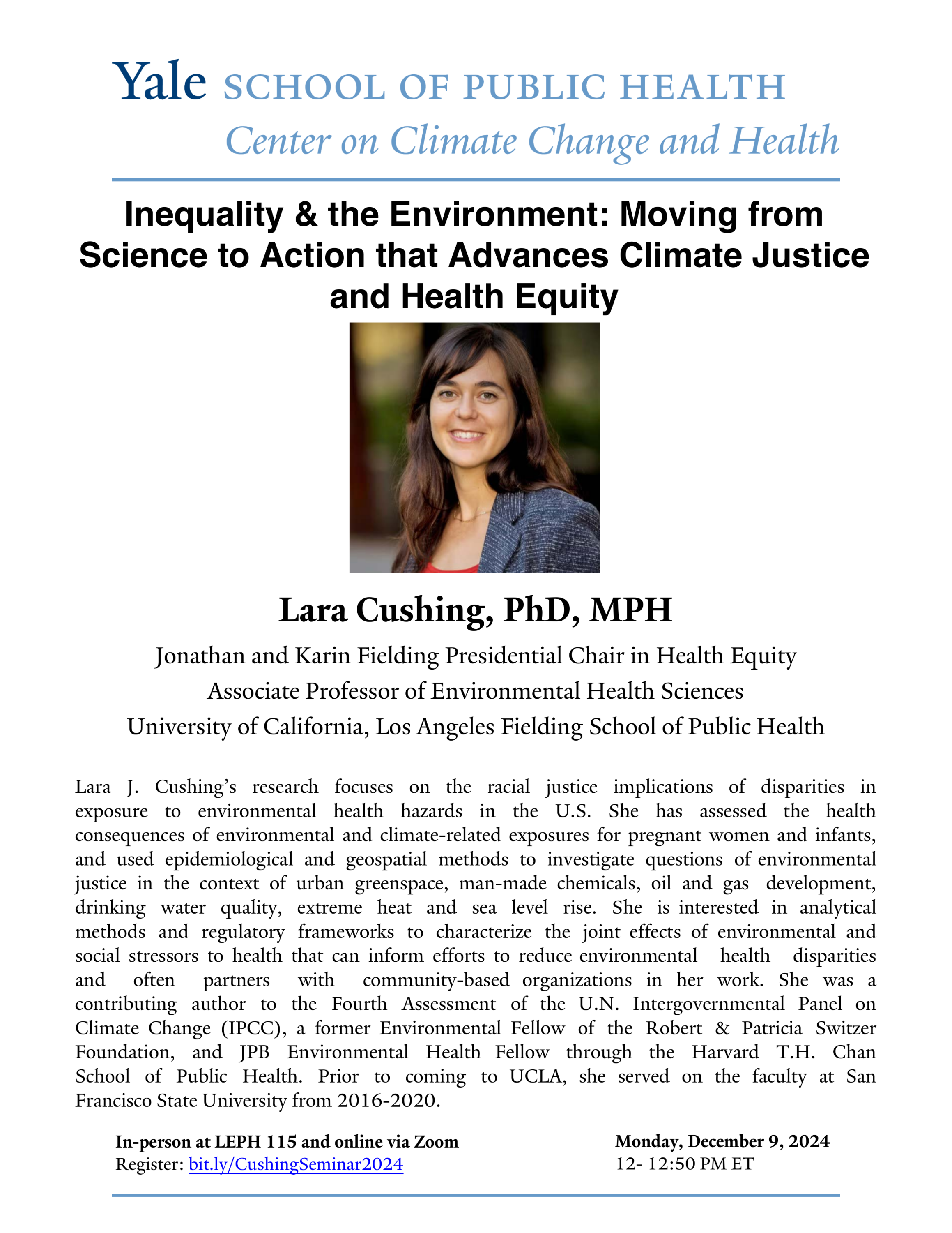 YSPH Climate Change and Health Seminar with Dr. Lara Cushing, "Inequality & the Environment: Moving from Science to Action that Advances Climate Justice and Health Equity"