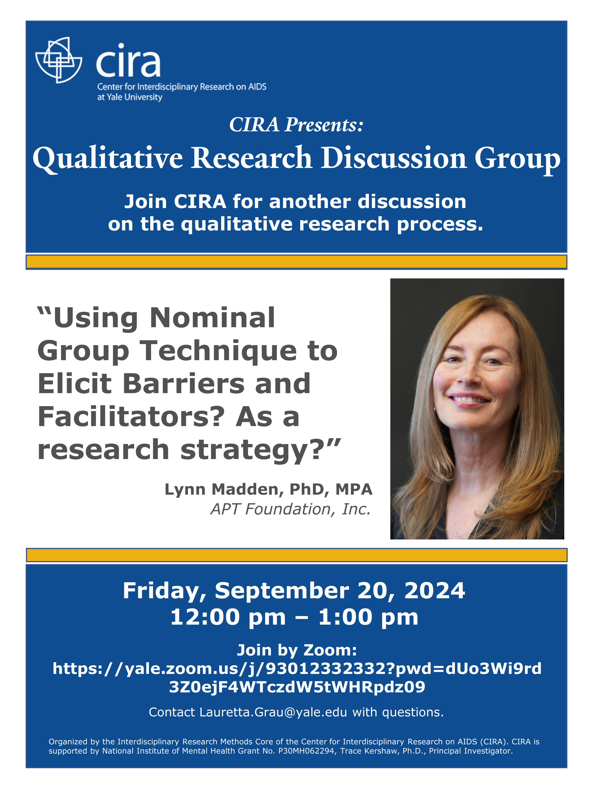 The goal of the Qualitative Research Discussion Group (QRDG) is to provide opportunities for individuals involved in qualitative or mixed-methods research to meet regularly to discuss the qualitative research process and potentially problem-solve issues that may arise when engaged in qualitative research. Discussion topics include, but are not limited to: logistics, data management, analysis, dissemination, role of the researcher, and ethics. It is intended as a venue for discussing research in progress and new or relevant literature on qualitative methods and practice as well as to create networking opportunities and foster research collaborations. CIRA's Dissemination Implementation Science and Methods (DISM) Core member, Lauretta Grau, PhD, is coordinating the meetings. She can be reached at lauretta.grau@yale.edu.