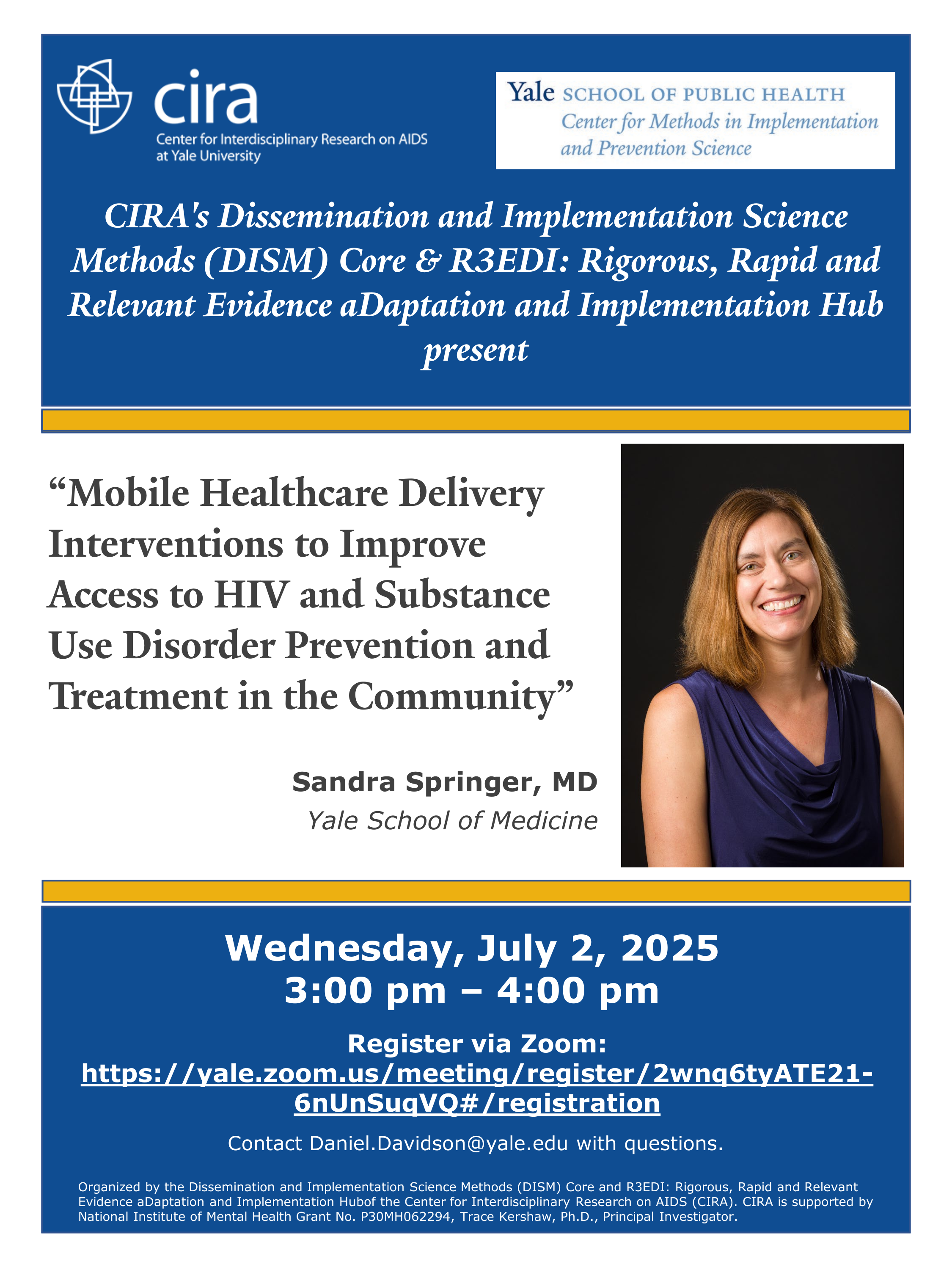 Sandra Springer, MD is a Professor of Medicine in the Department of Internal Medicine, Section of Infectious Diseases at the Yale School of Medicine. She received an A.B from Harvard College; an MD from University of Massachusetts Medical School; and completed her internal medicine residency and infectious disease fellowship at Yale School of Medicine. She is Board-Certified in Internal Medicine, Infectious Diseases and Addiction Medicine and is the Director of the Infectious Disease Clinic at the Newington site of the Veterans Administration Connecticut Healthcare System. She is an appointed member of the International Antiviral Society–USA (IAS–USA) Antiretroviral Guidelines Panel as well as a Core Faculty member with IAS-USA, and she has been appointed to the National Academies of Sciences, Engineering, and Medicine’s Committee on the Framework for the Consideration of Chronic Conditions in Women and to the Committee on the Examination of the Integration of Opioid and Infectious Disease Prevention Efforts in Select Programs. Her research centers on the integration of substance use and infectious diseases with a focus on opioid use disorder treatment and the treatment and prevention of HIV infection. In 2022, she was awarded a NIDA Avant Garde award for her innovative proposal to bring mobile health care for substance use and infectious diseases to where people live, through a mobile pharmacy and clinic. She has published over 150 manuscripts and book chapters. She is the director of her clinical research lab InSTRIDE (Integrating Substance use Treatment Research with Infectious Disease for Everyone) which encompasses a multidisciplinary team including research staff, clinicians, community health workers, and patient navigators as well as a mobile health unit and a mobile pharmacy and clinic. https://medicine.yale.edu/lab/springer/