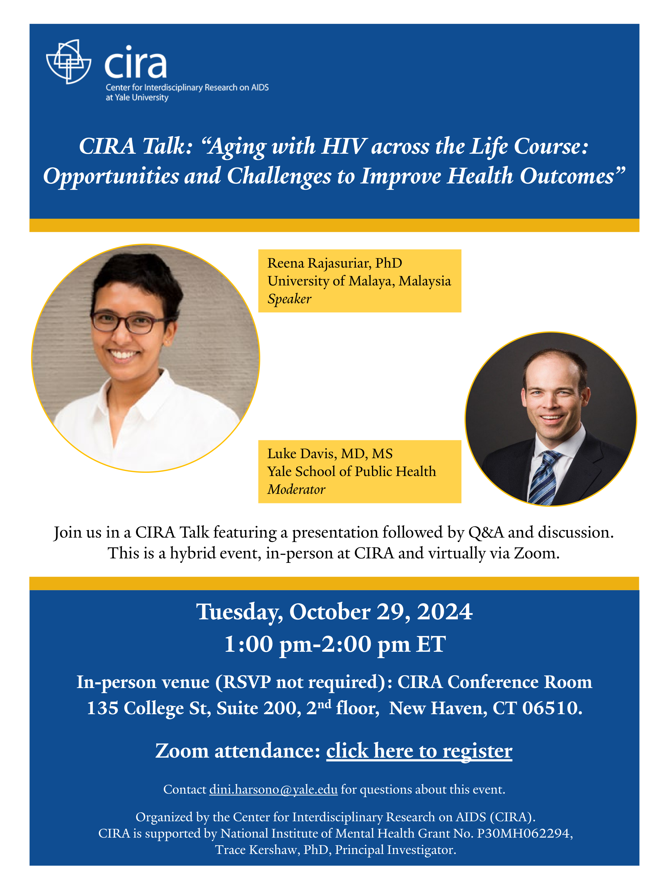 Join the Center for Interdisciplinary Research on AIDS (CIRA) at Yale University for a CIRA Talk event with speaker Reena Rajasuriar, PhD, an Associate Professor at the Department of Medicine, University of Malaya, Malaysia; an Honorary Fellow at the Department of Infectious Diseases, Melbourne University, Australia; and a former CIRA international visiting fellow (2019-2021). This session will be moderated by Luke Davis, MD, MS, Yale School of Public Health.