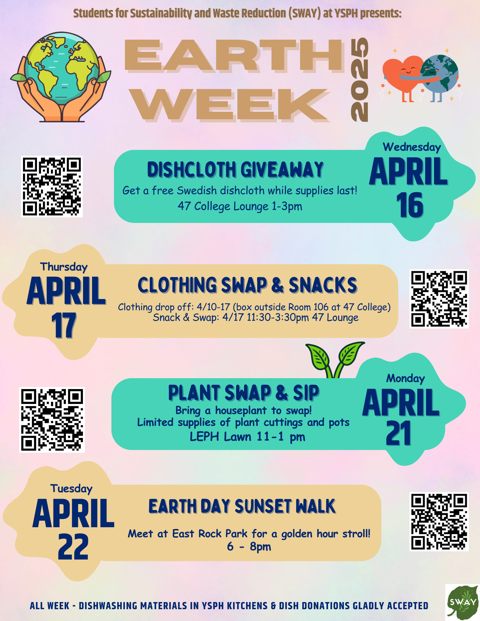 As a part of Yale's campus-wide celebration of Earth Week, the Students for Sustainable Waste Reduction at YSPH (SWAY) are hosting a series of events from April 16-22.