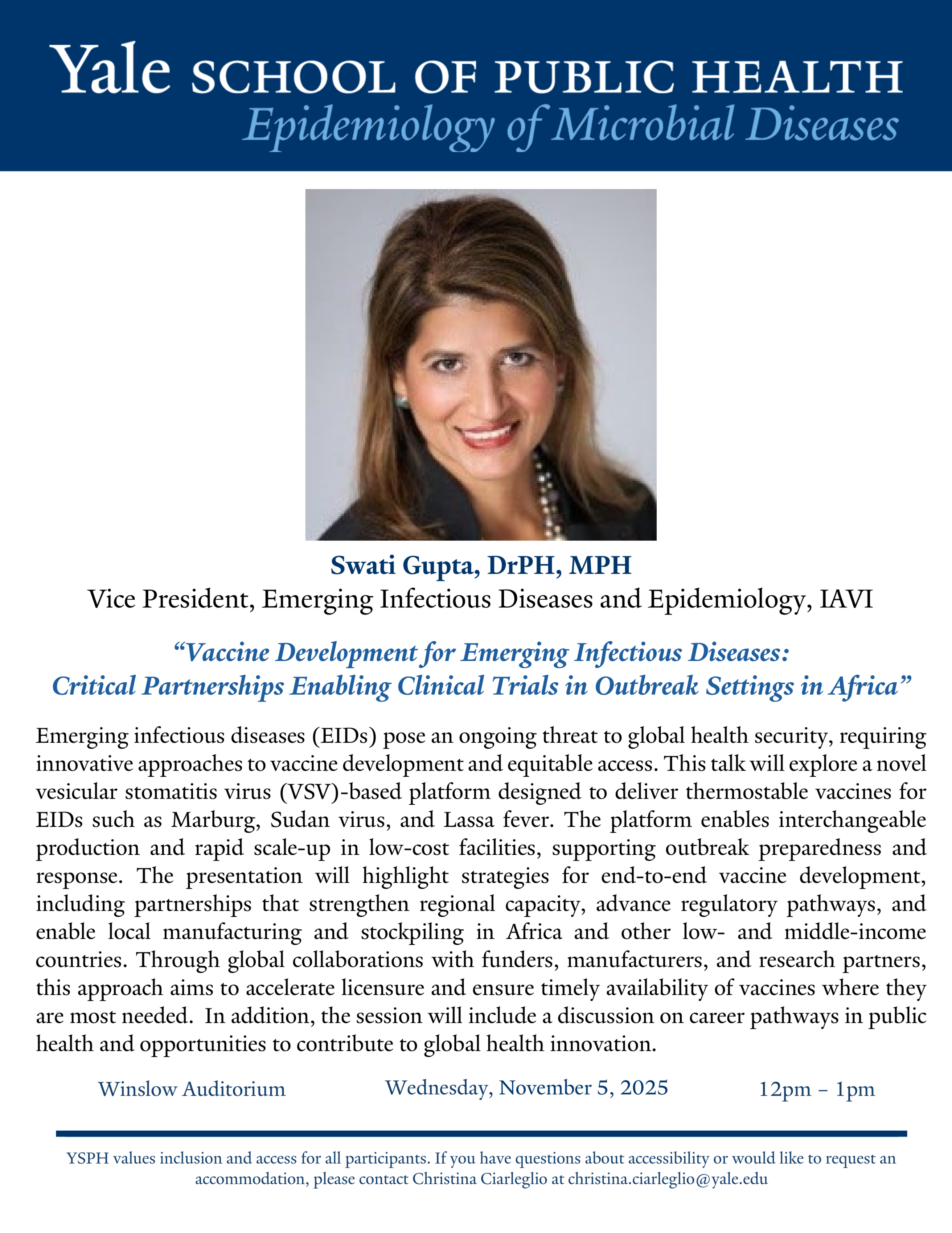 EMD Seminar Series: Swati Gupta - "Vaccine Development for Emerging Infectious Diseases: Critical Partnerships Enabling Clinical Trials in Outbreak Settings in Africa"