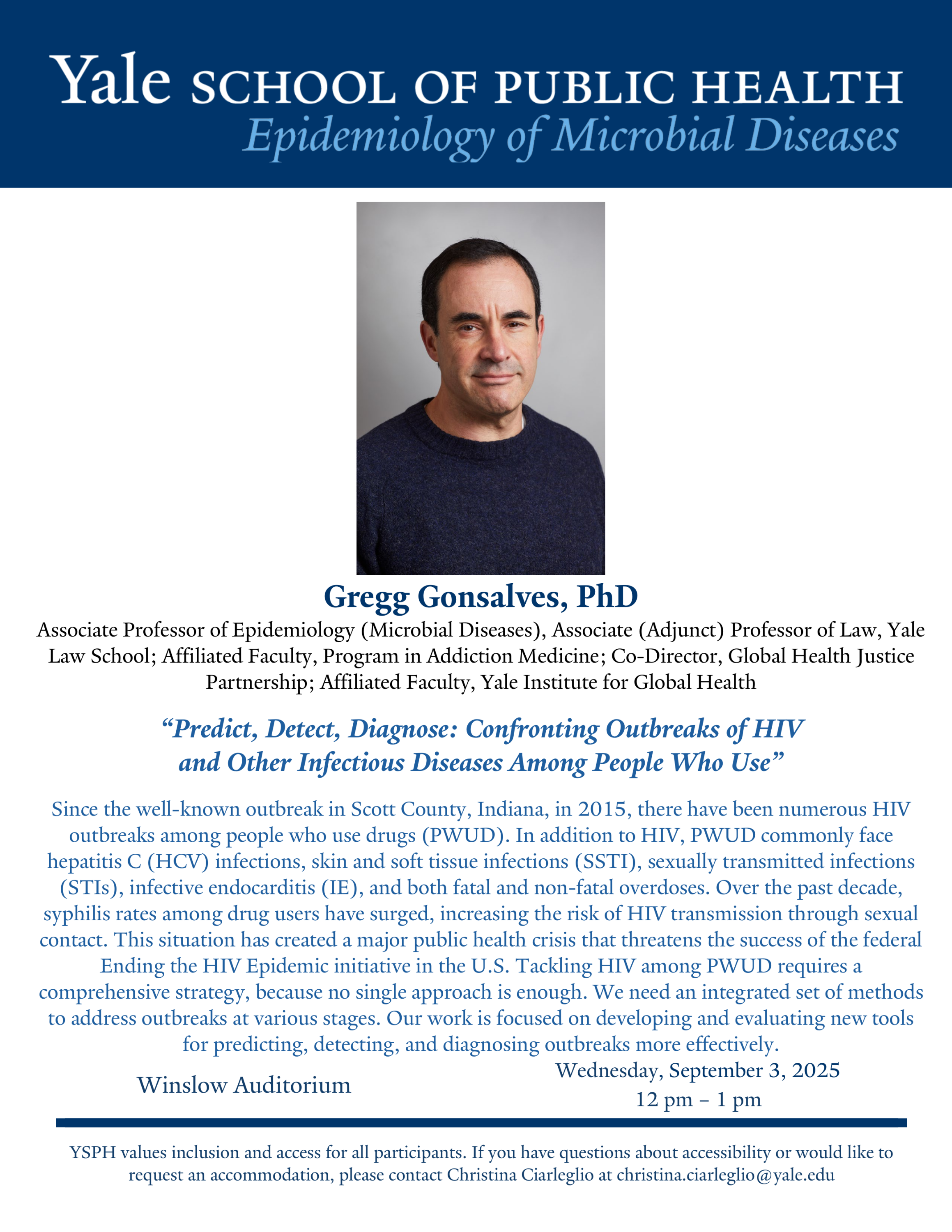If you have questions about accessibility or would like to request an accommodation, please contact Christina Ciarleglio at christina.ciarleglio@yale.edu