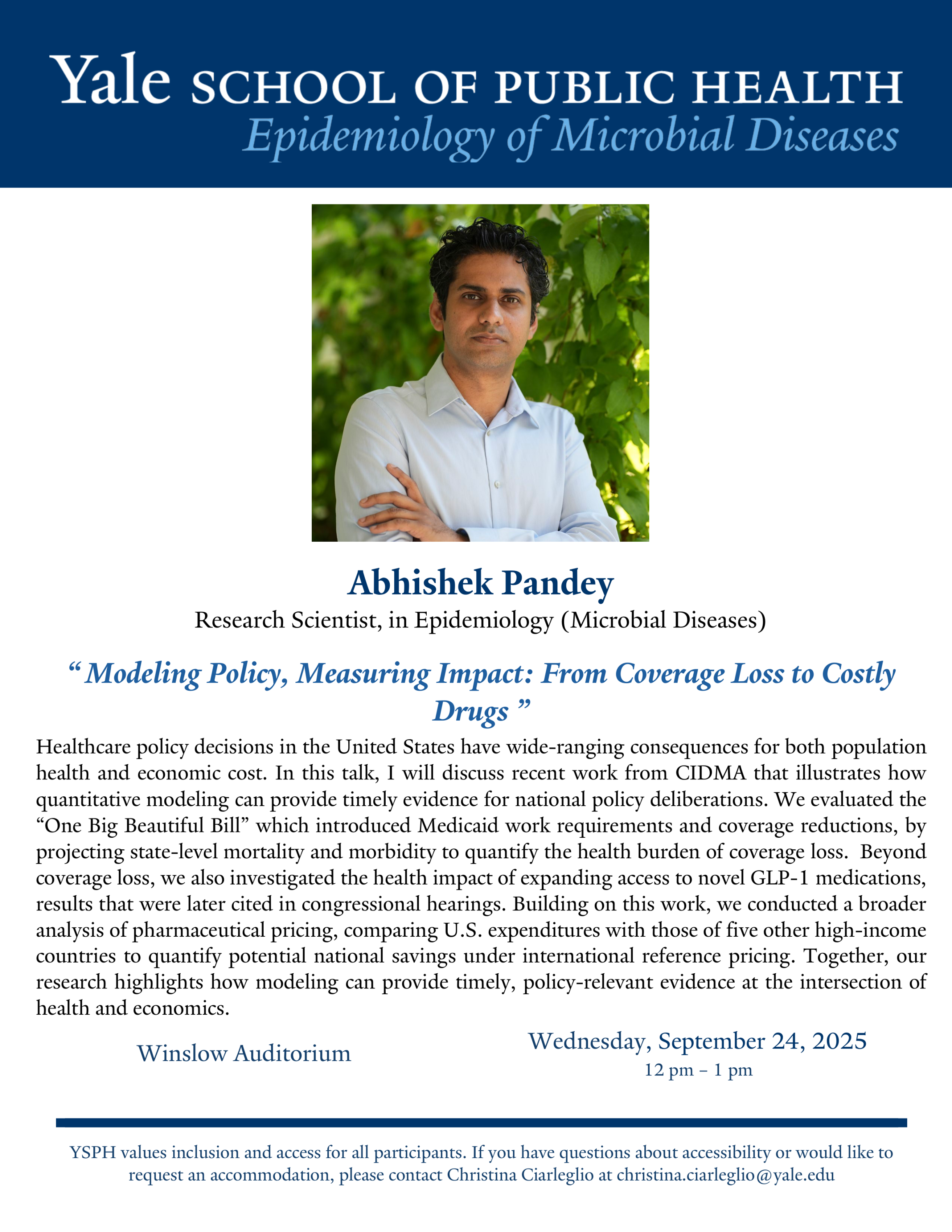 If you have questions about accessibility or would like to request an accommodation, please contact Christina Ciarleglio at christina.ciarleglio@yale.edu