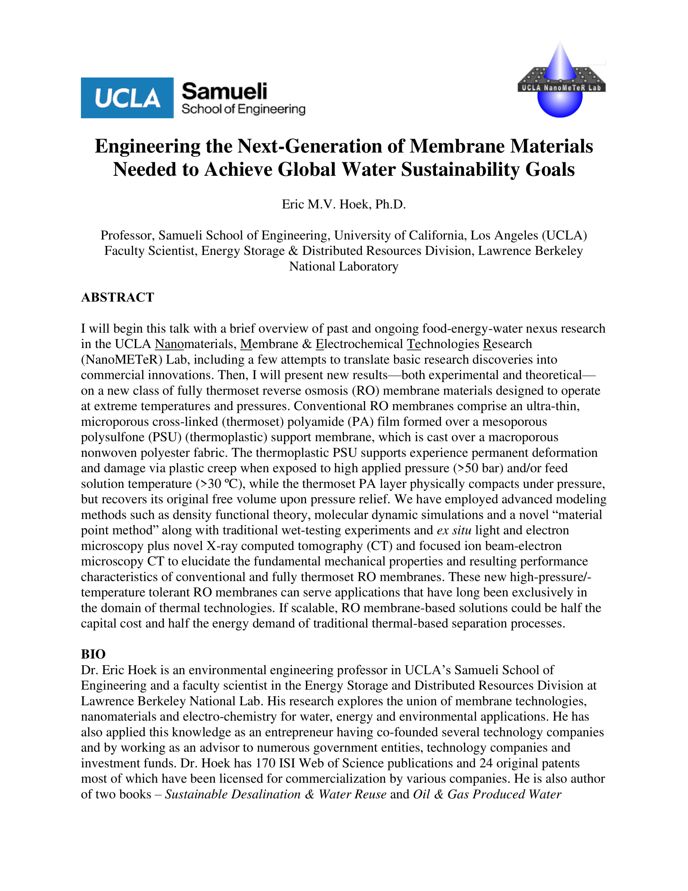 Dr. Eric Hoek will begin this talk with a brief overview of past and ongoing food-energy-water nexus research in the UCLA Nanomaterials, Membrane & Electrochemical Technologies Research (NanoMETeR) Lab, including a few attempts to translate basic research discoveries into commercial innovations. Then, I will present new results––both experimental and theoretical––on a new class of fully thermoset reverse osmosis (RO) membrane materials designed to operate at extreme temperatures and pressures. Conventional RO membranes comprise an ultra-thin, microporous cross-linked (thermoset) polyamide (PA) film formed over a mesoporous polysulfone (PSU) (thermoplastic) support membrane, which is cast over a macroporous nonwoven polyester fabric. The thermoplastic PSU supports experience permanent deformation and damage via plastic creep when exposed to high applied pressure (>50 bar) and/or feed solution temperature (>30 ºC), while the thermoset PA layer physically compacts under pressure, but recovers its original free volume upon pressure relief. We have employed advanced modeling methods such as density functional theory, molecular dynamic simulations and a novel “material point method” along with traditional wet-testing experiments and ex situ light and electron microscopy plus novel X-ray computed tomography (CT) and focused ion beam-electron microscopy CT to elucidate the fundamental mechanical properties and resulting performance characteristics of conventional and fully thermoset RO membranes. These new high-pressure/-temperature tolerant RO membranes can serve applications that have long been exclusively in the domain of thermal technologies. If scalable, RO membrane-based solutions could be half the capital cost and half the energy demand of traditional thermal-based separation processes.