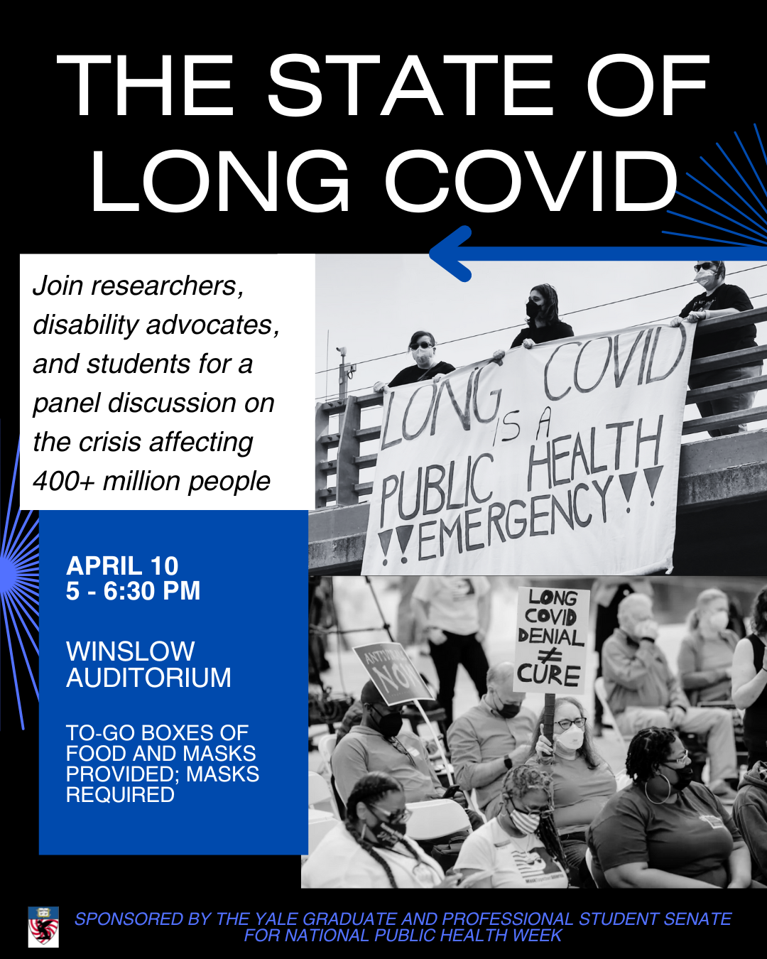 The Yale Graduate and Professional School Senate's committee on Diversity, Equity, Inclusion, Accessibility, and Belonging is holding a panel discussion for Yale's medical, public health, and scientific communities. Researchers focused on Long COVID, disability advocates, and students who have been affected by the virus will discuss the condition's far-reaching effects, disability justice amid prevalent spread, and emerging research findings on causes and treatments.