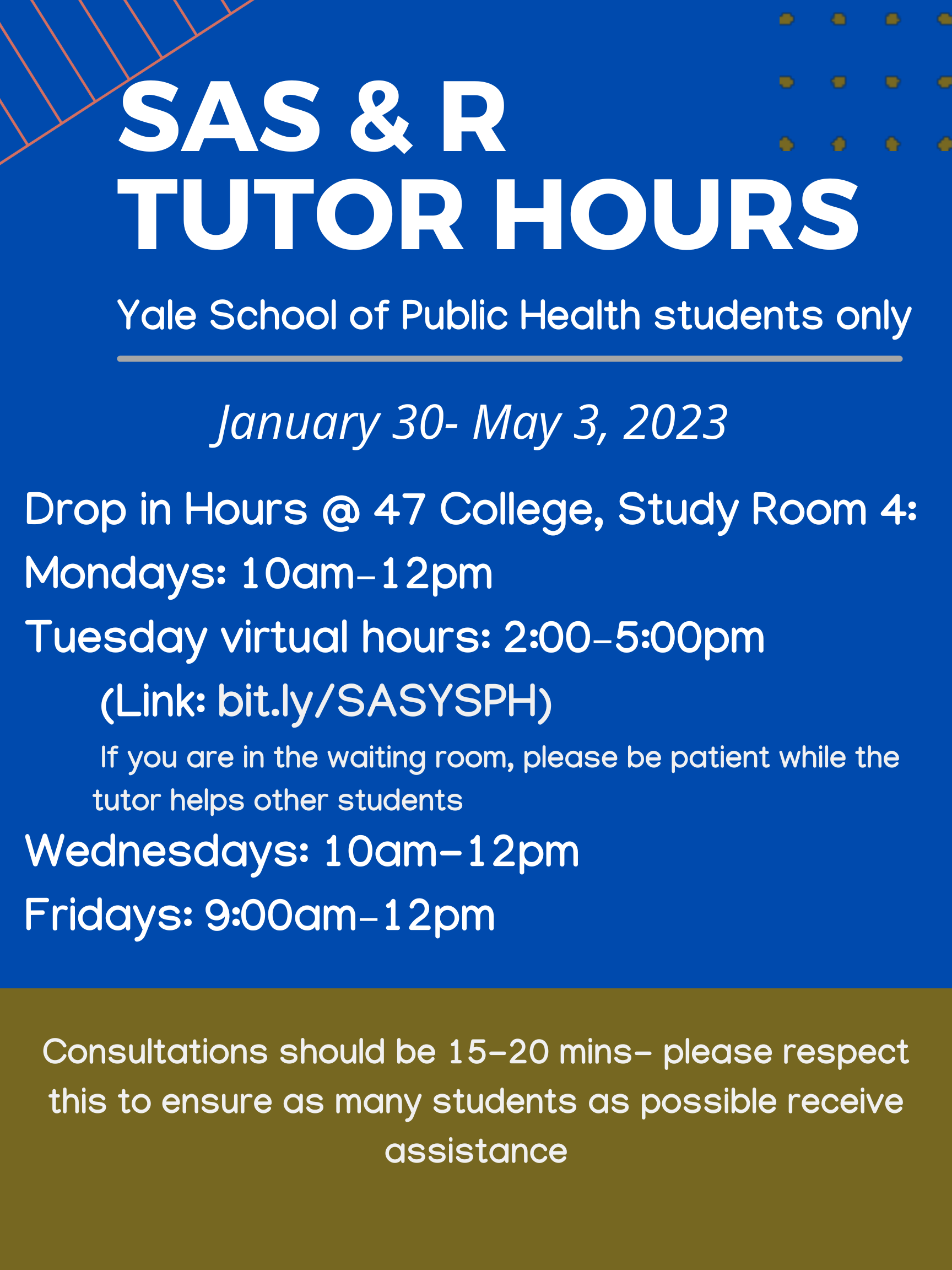 School OnlyYSPH SAS/R Tutor office hours47 College StreetAdd event to CalendarAdd event series to CalendarSAS/R Tutor office hours are for YSPH students only. Consultations are 15-20 minute max.ContactKatie Doucet203.785.4257katie.doucet@yale.eduAdmissionFreeEvent TypeOtherMar 202329Wednesday10:00 AM12:00 PMDownload FlyerEdit This Event