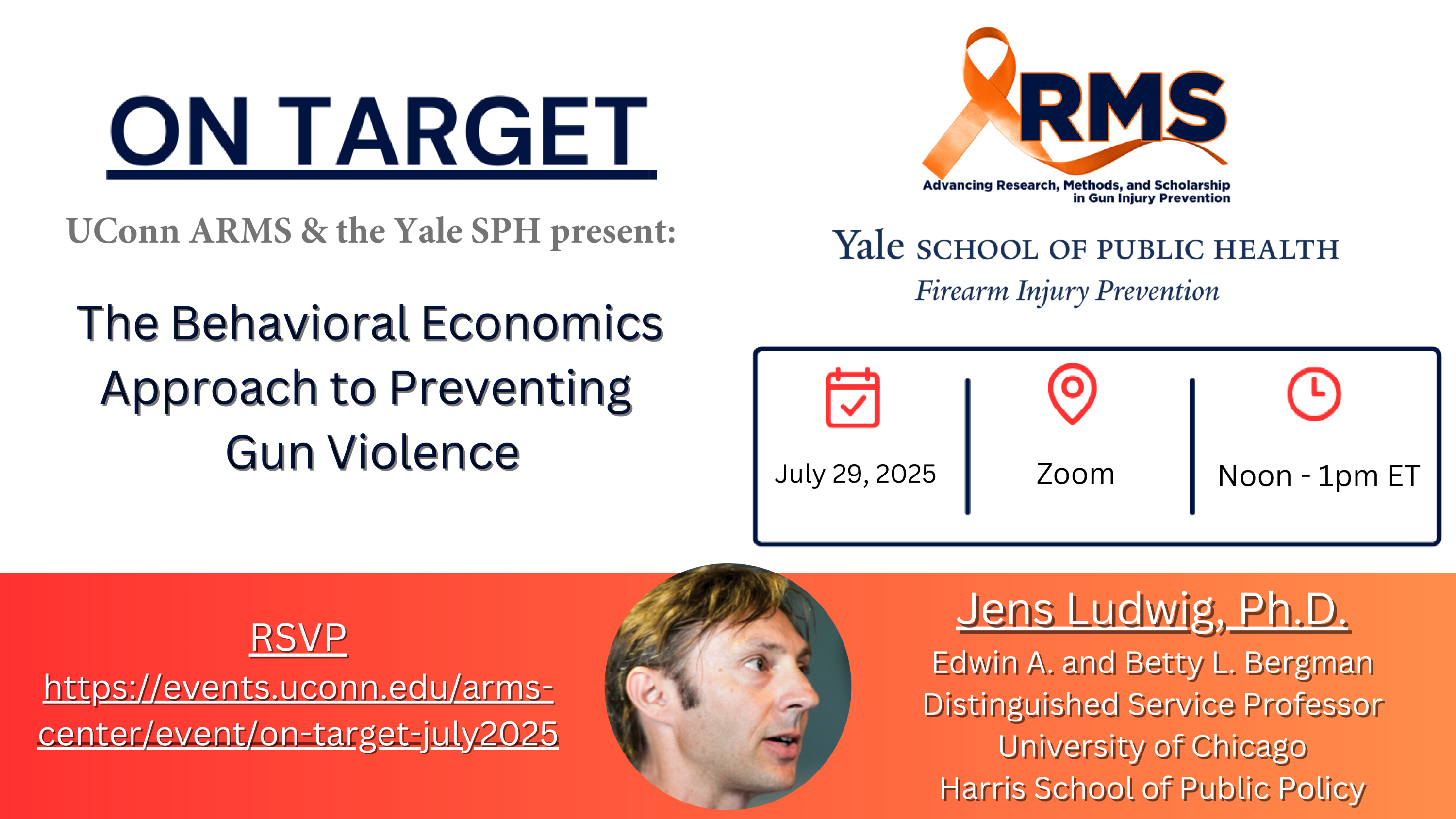 Co-sponsored by the UConn ARMS Center and The Yale School of Public Health’s Firearm Injury consortium, On Target is a monthly virtual seminar to advance our understanding of firearm injury prevention.