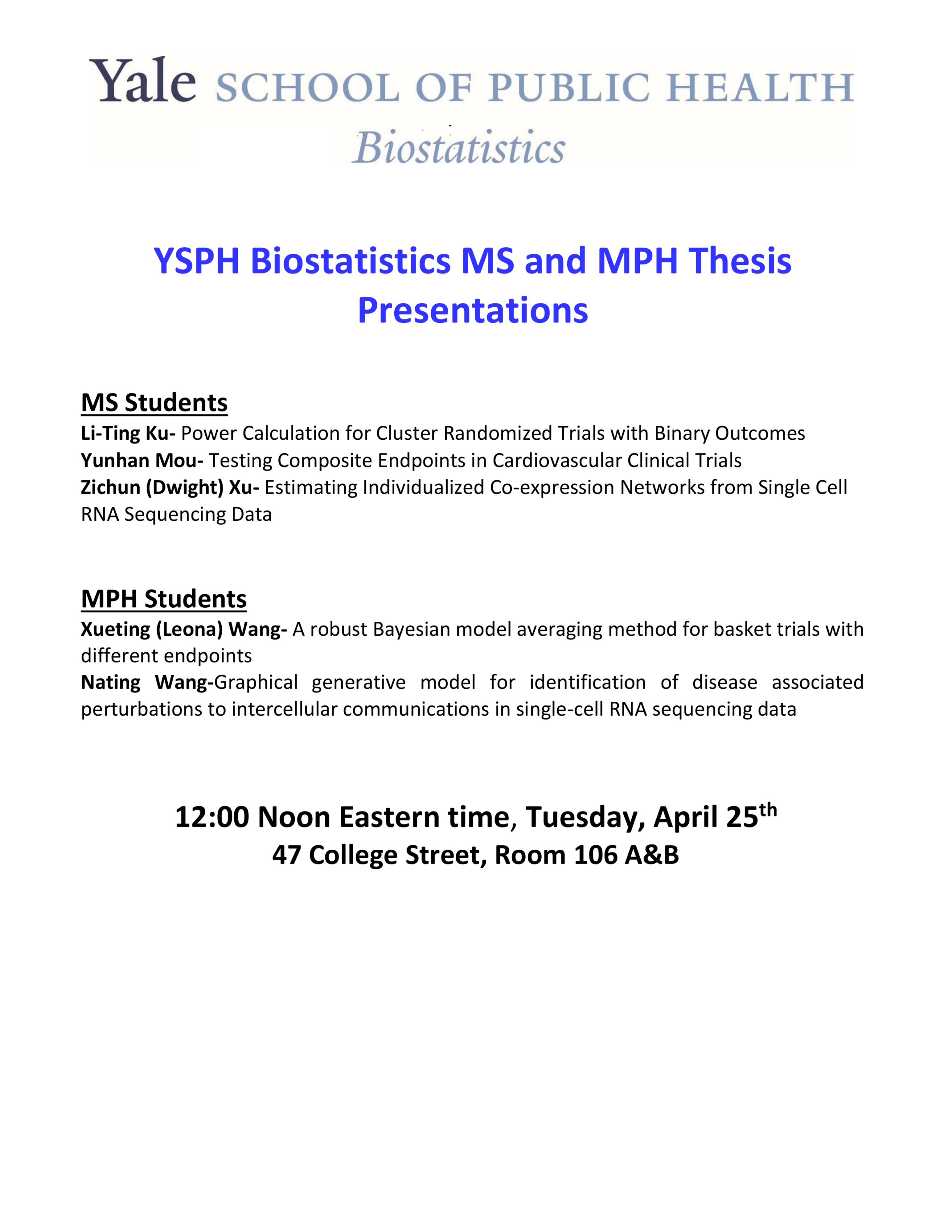 YSPH Biostatistics Seminar: MS and MPH Thesis Presentations