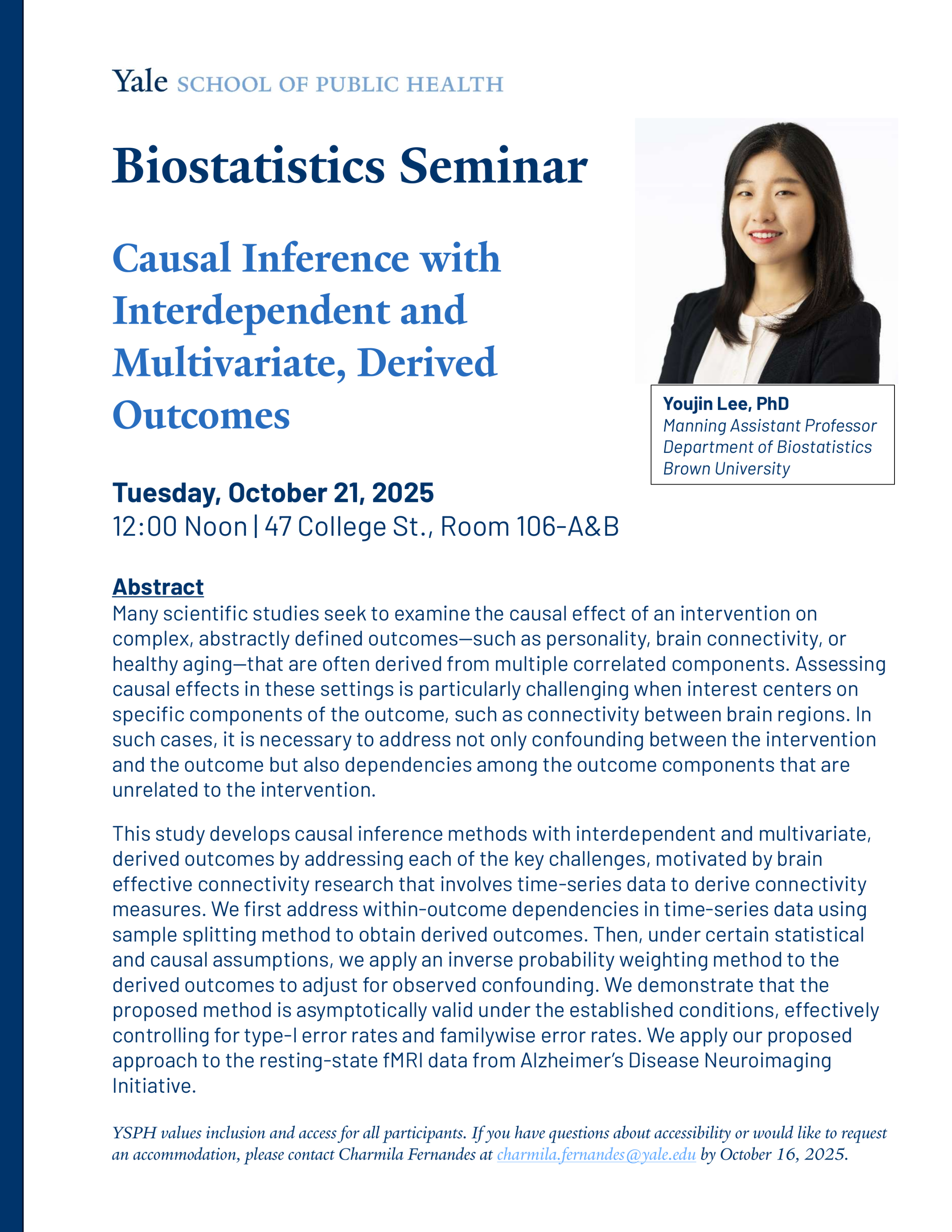 YSPH values inclusion and access for all participants. If you have questions about accessibility or would like to request an accommodation, please contact Charmila Fernandes at Charmila.fernandes@yale.edu. We will try to provide accommodations requested by October 16, 2025.