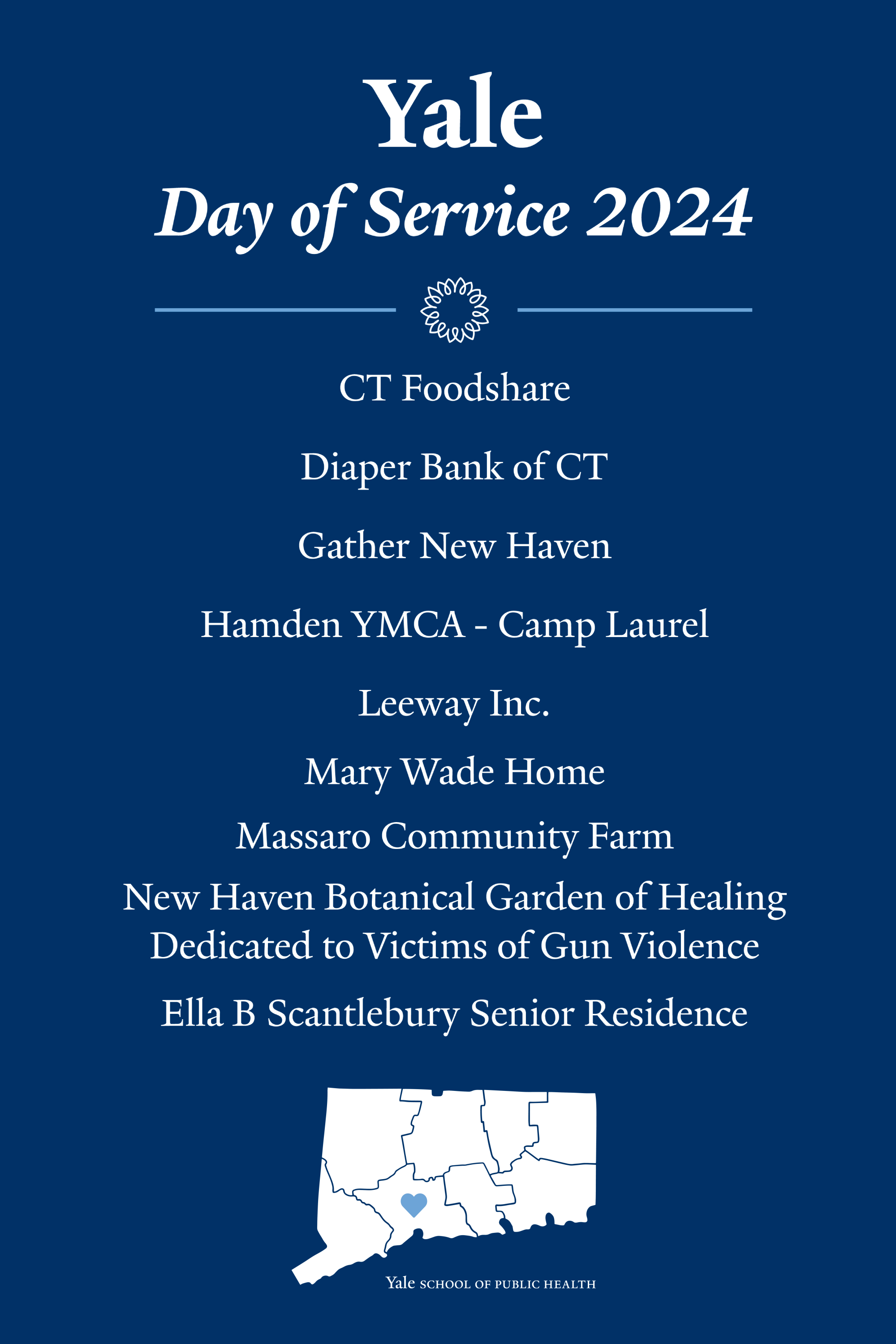 Join for Yale School of Public Health Day of Service 2024. YSPH faculty, staff, and students will volunteer at sites: CT Foodshare, Diaper Bank of CT, Gather New Haven, Hamden YMCA-Camp Laurel, Leeway Inc., Mary Wade Home, Massaro Community Farm, New Haven Botanical Garden of Healing Dedicated to Victims of Gun Violence, Ella B Scantlebury Senior Residence. Participants are invited to join a post-service lunch.