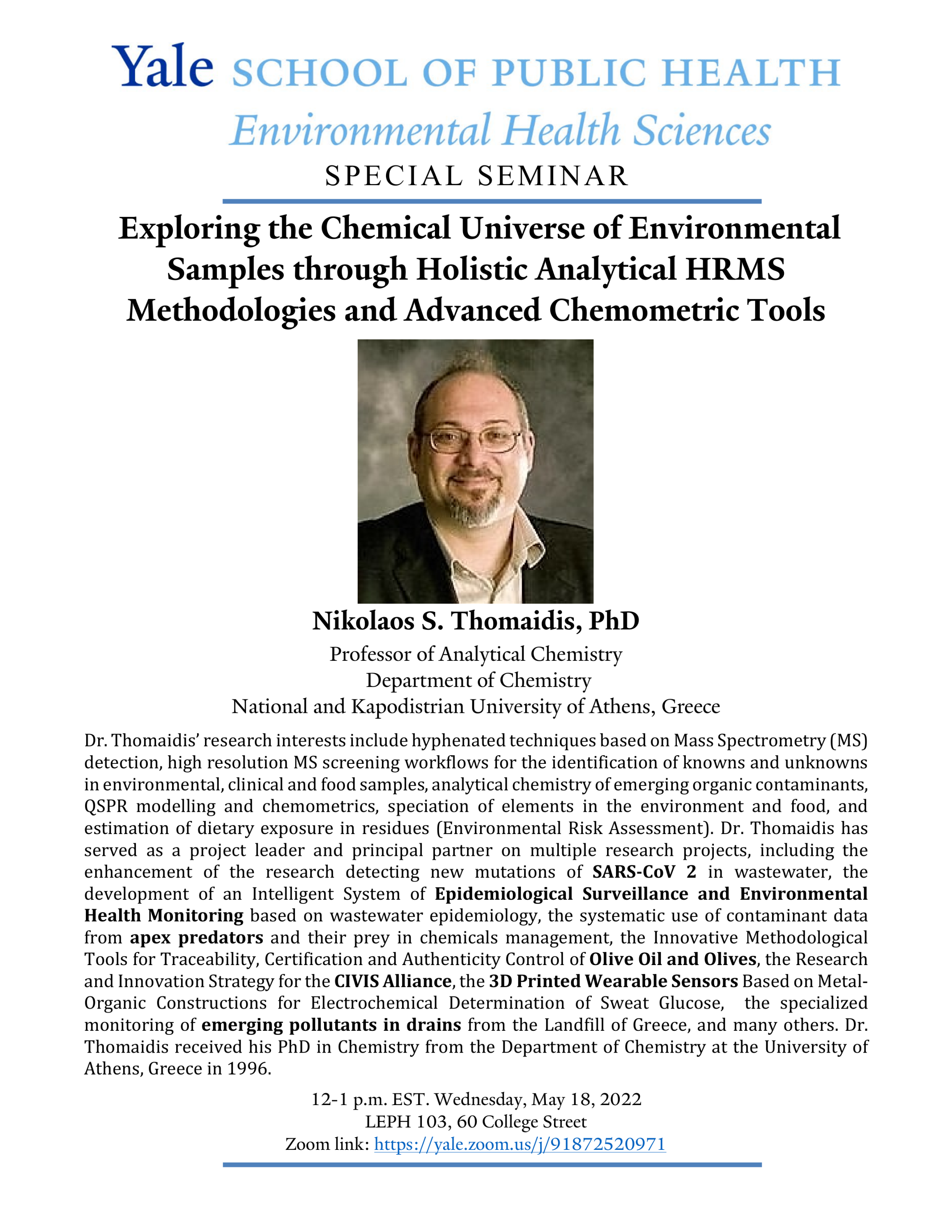 YSPH EHS Special Seminar: "Exploring the Chemical Universe of Environmental Samples through Holistic Analytical HRMS Methodologies and Advanced Chemometric Tools”
