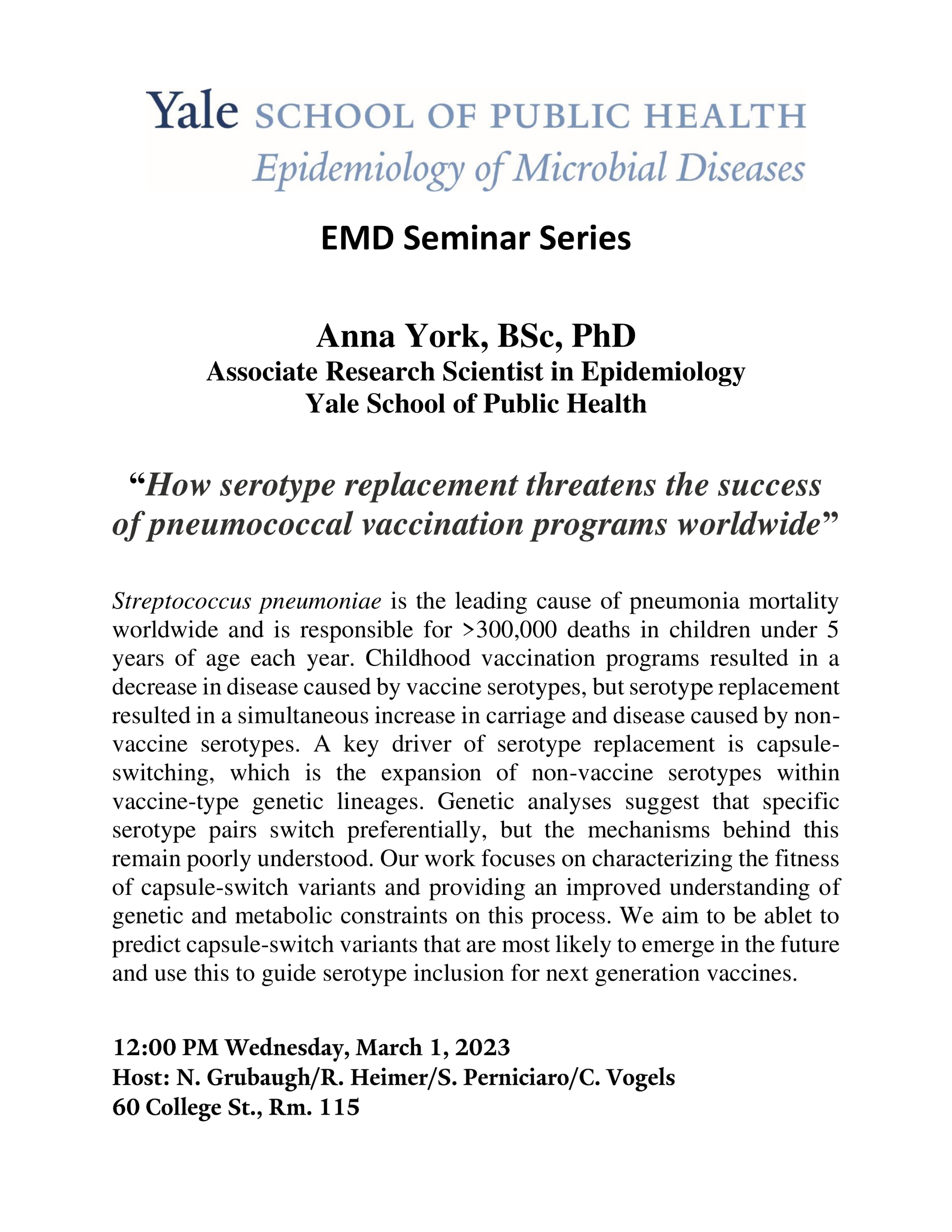 YSPH EMD Seminar: “How serotype replacement threatens the success of pneumococcal vaccination programs worldwide”