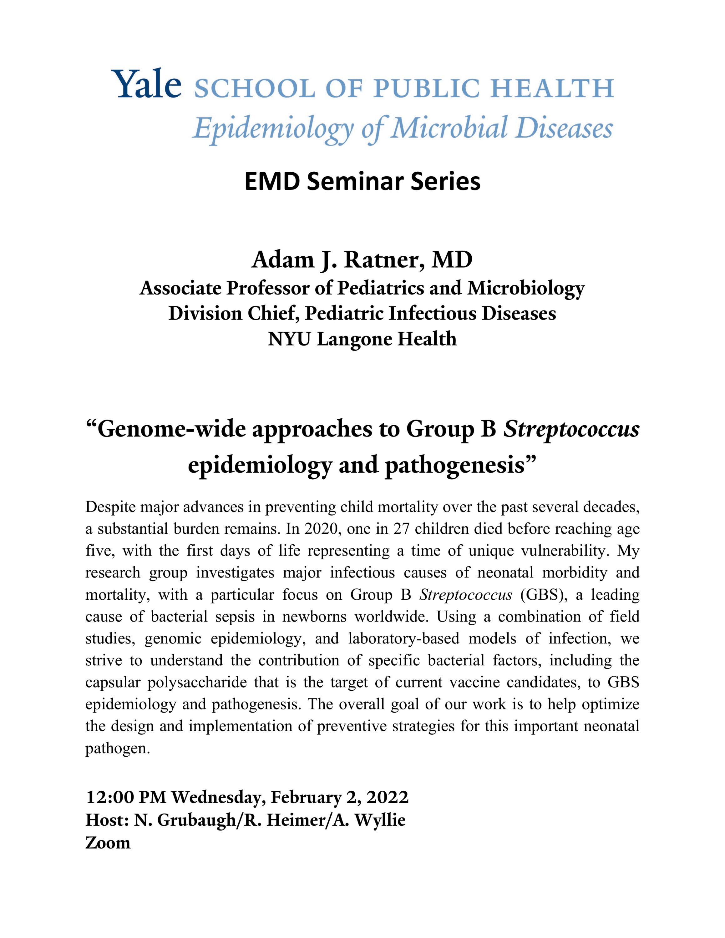 YSPH EMD Seminar Series: "Genome-wide approaches to Group B Streptococcus epidemiology and pathogenesis"