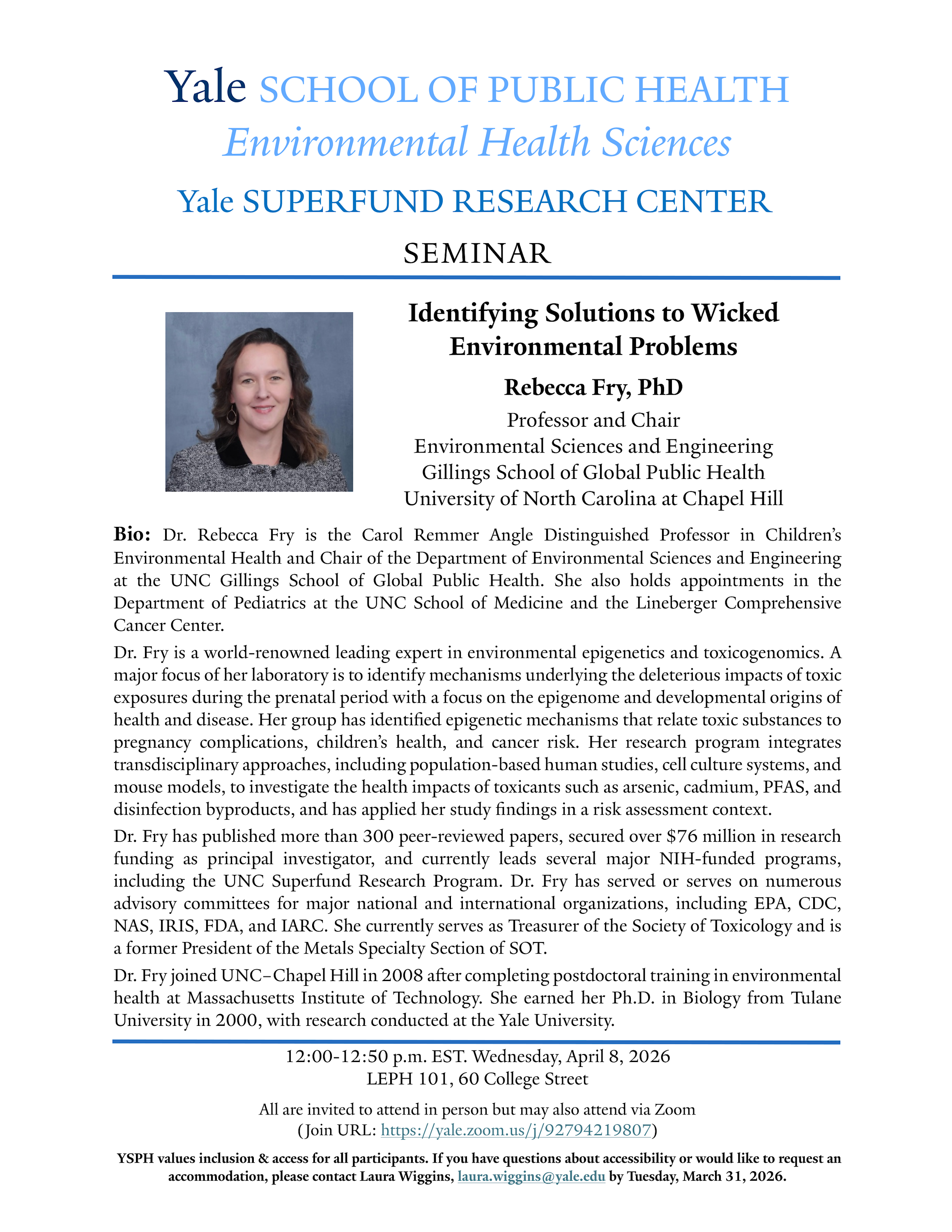 Speaker: Rebecca Fry, PhD - Professor and Chair, Environmental Sciences and Engineering- University of North Carolina at Chapel Hill
